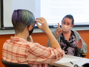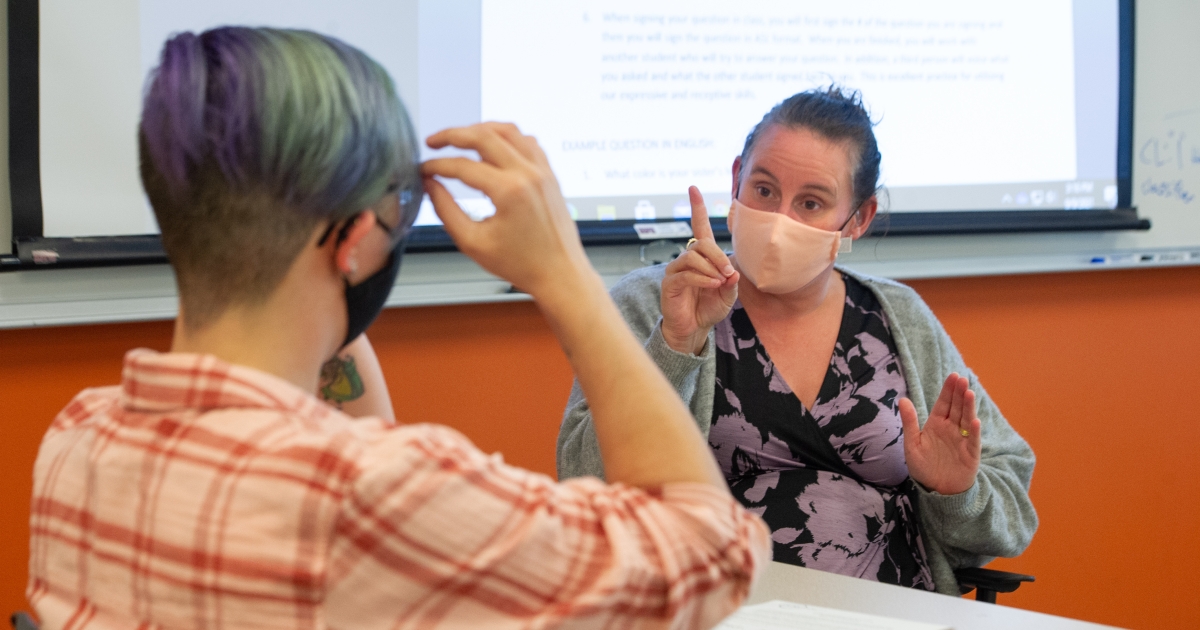 Above: Amy Crockford teaches ASL to a Buffalo State student.