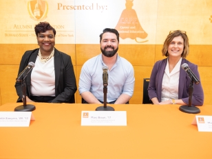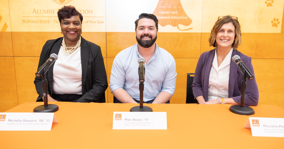 The alumni career panel speakers, Michelle Sawyers, ’09, ’13, president and CEO at the YWCA of Western New York; Marc Braun, ’17, human resources business partner at Superior Lubricants Company, Inc.; and Michelle Plesh, ’89, lecturer for the Buffalo State Business Department and director of human resources and organizational development at Excelsior Orthopaedics; shared their professional journeys and offered insights that emphasized how Buffalo State set them up for success.