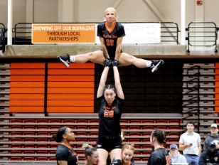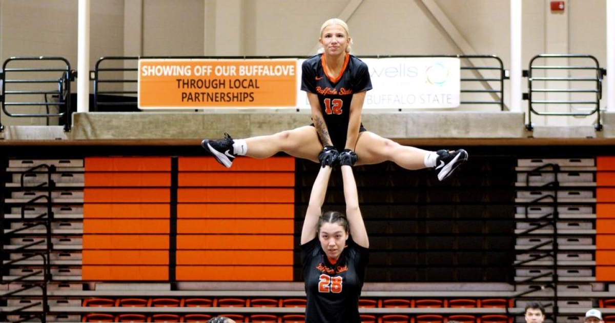 On Saturday afternoon, Buffalo State acrobatics and tumbling kicked off the inaugural season by hosting Trine in a dual meet at the Sports Arena. Lucy Ingro (Newfane, NY/Newfane) and Adrienne Gardner (Fairfield, CA/St. Patrick-St. Vincent) combined to take the program’s first heat victory, scoring a 7.90 in the duo pass heat of the Tumbling Event. The best individual heat score of the meet for Buffalo State came in the open pyramid heat, as the group topped by Carmela Capizzi (Tonawanda, NY/Kenmore East) earned a score of 8.40 during the Pyramid Event. Gardner, Caitlin Wilhite (Lancaster, NY/Lancaster), and Jackie Heyden (Grand Island, NY/Grand Island), with Ingro as a spotter, also came away with a score of 8.15 in the opening heat of the Acro Event.