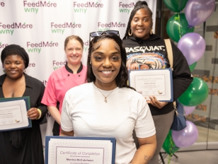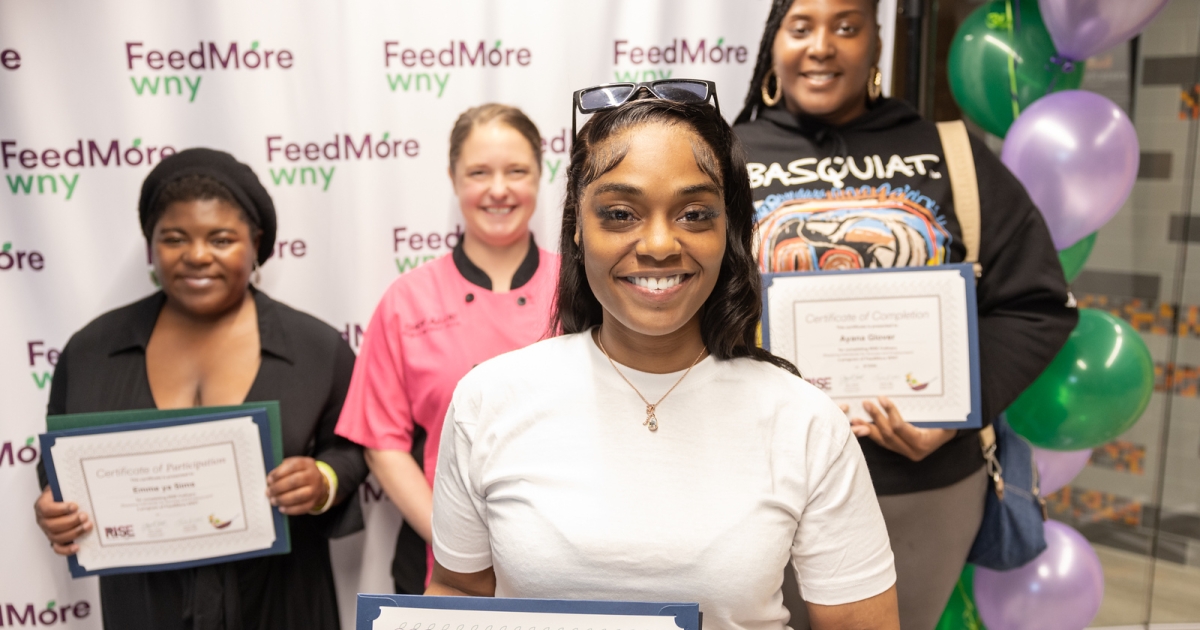 Buffalo State University and FeedMore WNY celebrated the first cohort of FeedMore WNY’s Culinary and Food Manufacturing Program, the newest course in its workforce development initiative, Readying Individuals for Success and Employment (RISE), with a graduation ceremony on June 10. Buffalo State and FeedMore WNY partnered to hold classes—and the graduation ceremony—in the dietetics kitchen in Caudell Hall.