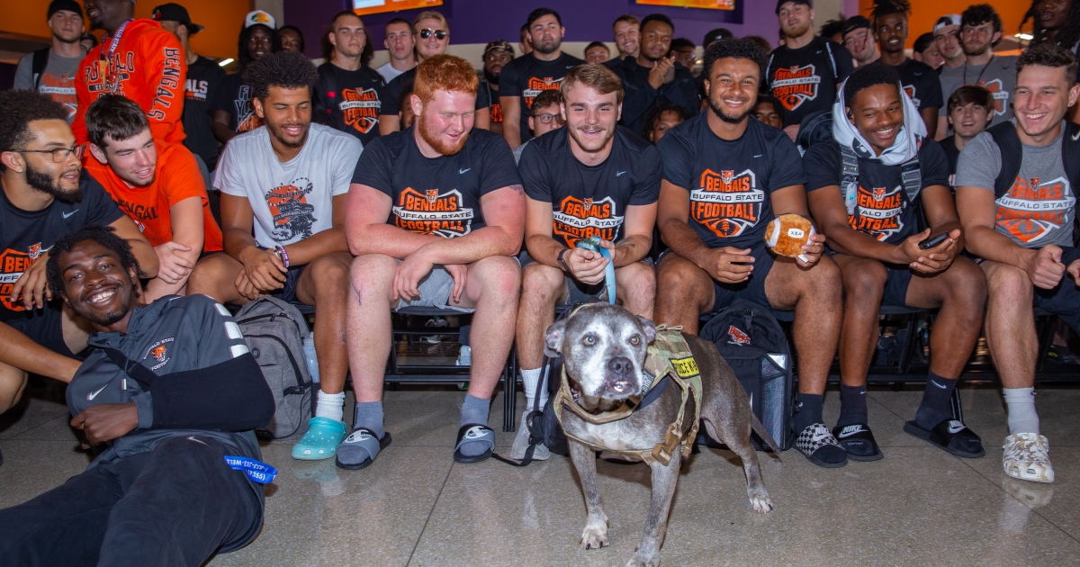 Lloyd sniffed his surroundings, accepted treats, and posed for numerous photo ops. He was presented with his own library card at Butler Library before being sworn in as an honorary K-9 by Stephen Mayoral, the new chief of university police, in the Student Union lobby. Numerous onlookers attended the ceremony, including Buffalo State football players who presented Lloyd with a stuffed football and cheered him on. Lloyd accepted more pets and belly rubs before climbing into a patrol car for a short ride with police.