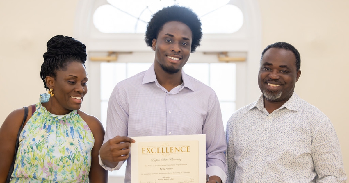 The Arthur O. Eve Educational Opportunity Program at Buffalo State University celebrated the exemplary academic performance of its students during the annual EOP Honors Convocation on May 9 in the Performing Arts Center at Rockwell Hall. Carlos Muhammad, ’96, ’03, associate director of the Maryland Educational Opportunity Center, was honored with the Distinguished Alumnus Award. The EOP Honors Convocation recognized students who obtained a 3.0 semester or cumulative GPA during the 2023 calendar year. Special awards were also given to faculty, staff, and outstanding students who have provided valuable contributions to EOP.