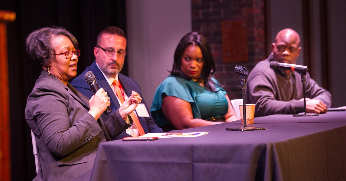 In the afternoon, Buffalo State President Katherine Conway-Turner sat on a panel along with Erie County legislators April Baskin and Howard Johnson, and Luke Carnicelli, principal at Southern Cayuga High School. Buffalo State’s Peter Yacobucci, associate professor of political science, served as the moderator, relaying questions that participants had submitted.