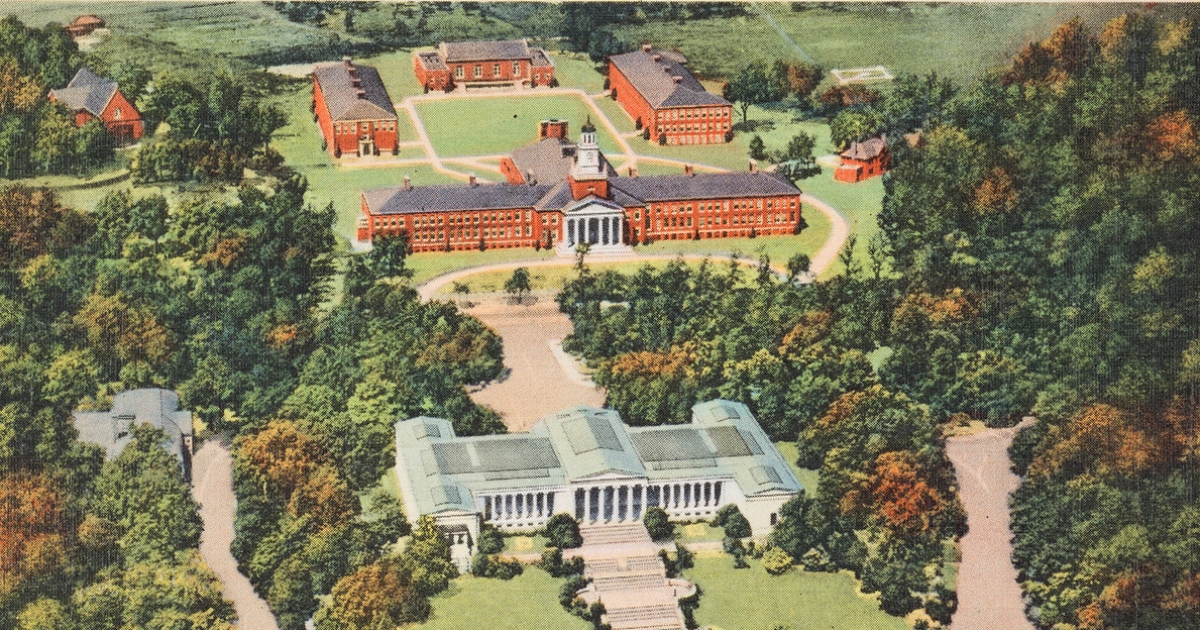 Original campus buildings, clockwise from foreground: Administration (Rockwell), Vocational (Ketchum), Gymnasium (Savage), and School of Practice (Bacon).