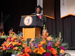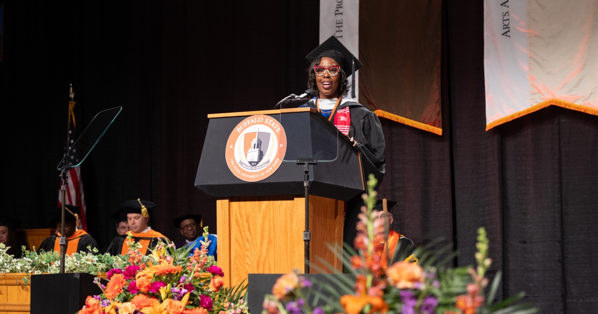 Morgan Hardy, ’03, chief executive officer for Leadership Buffalo, delivered a powerful speech to the graduating Class of 2025 during the School of Arts and Sciences afternoon Commencement ceremony on Saturday, May 17. Hardy addressed a full crowd in the Sports Arena for Buffalo State’s 153rd annual Commencement, during which the university conferred degrees on nearly 1,700 undergraduate and graduate students over three ceremonies.
