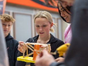 Students worked together in small teams using wooden dowels, popsicle sticks, tape, and glue to create a bridge that could support a hanging weight from its center, then tested it with a combination of books and water bottles to see how much weight the bridge could withstand before breaking.