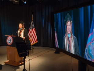 Pictured top: 2020 Commencement graduate student speaker, Christine Garas, recording her student address