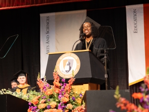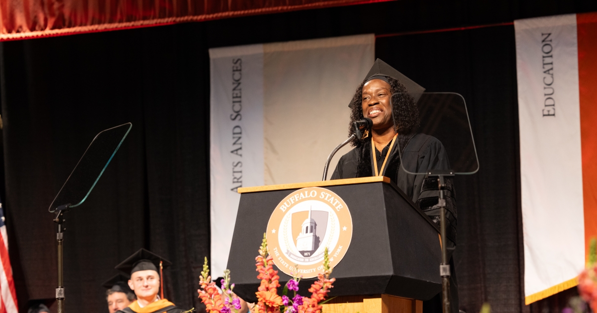 Sheila Rayam, ’90, executive editor of the Buffalo News, delivered a moving speech to the graduating Class of 2024 during the School of Arts and Sciences afternoon Commencement ceremony on Saturday, May 18. Rayam addressed a full crowd in the Sports Arena for Buffalo State’s 152nd annual Commencement, during which the university conferred degrees on nearly 1,700 undergraduate and graduate students over three ceremonies.