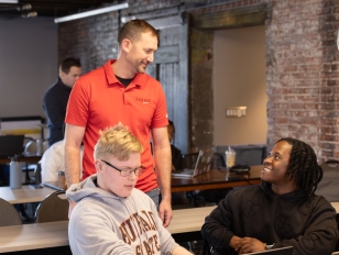 Top image: Paul Perry with Zachary Ziskowski (left) and Jarel Julien, both of whom were enrolled in ENT 340.